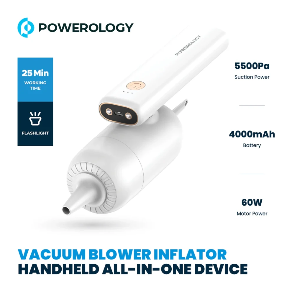 نقدم لكم جهاز Powerology القابل للطي بزاوية 180 درجة، وهو جهاز متعدد الوظائف يعمل بالمكنسة الكهربائية والمنفاخ والنفخ، باللون الأبيض.