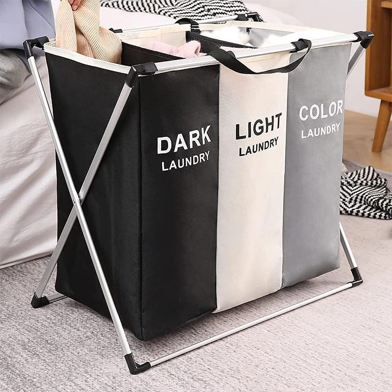 سلال غسيل ذات سعة كبيرة مكونة من 3 أقسام - مقسمة إلى 3 أقسام، حتى تتمكن من فرز الألوان الداكنة من الضوء أثناء وضع الملابس في الحقائب. يمكن لكل كيس غسيل أن يحمل ما يصل إلى حمولتين قياسيتين من الغسيل.