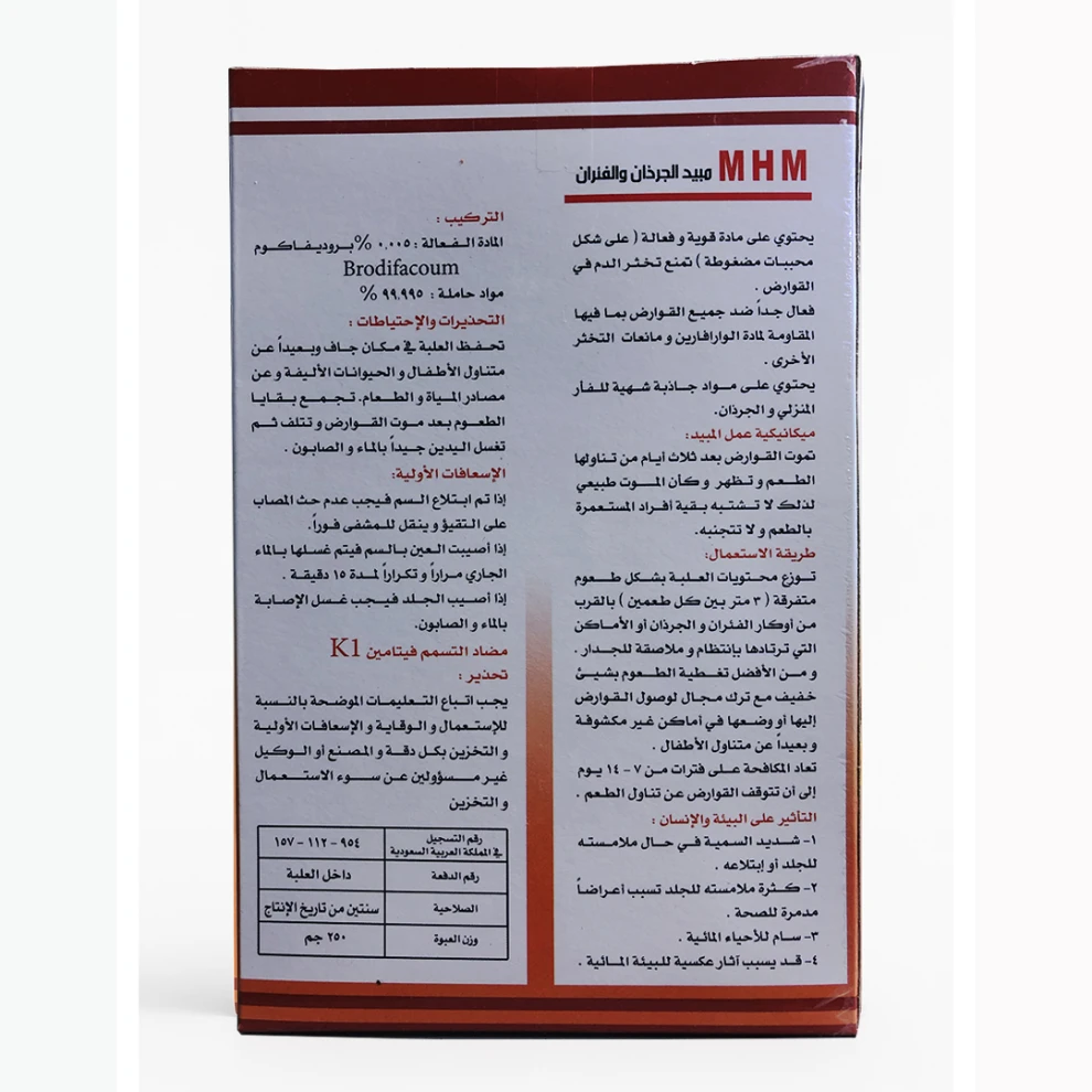 يحتوي على مادة قوية وفعالة على شكل حبيبات مضغوطة تمنع تخثر الدم لدى القوارض. وهو فعال جدًا ضد جميع القوارض، بما في ذلك تلك المقاومة للوارفارين ومضادات التخثر الأخرى. يحتوي على مواد جاذبة لذيذة للفئران والجرذان المنزلية. مفعول المبيد ميكانيكي. تموت القوارض بعد ثلاثة أيام من تناول الطعام، ويبدو الموت طبيعيًا. لذلك، لا يشك باقي أفراد المستعمرة في الطعام ولا يتجنبونه. طريقة الاستخدام: وزّع محتويات العلبة في طعوم منفصلة بالقرب من أعشاش الفئران والجرذان.