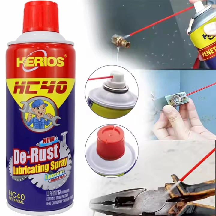 Herios Anti-Rust Spray Lubricant Penetrating Oil 450ml For rust cleaning, rust prevention, lubrication Suitable for all types of equipment and moving parts such as tools, dies, jigs, fixtures, automotive and marine engines and parts, mount pulleys, lawn and garden tools, wire ropes, etc. Increases the efficiency of moving parts and enhances machine service life Loosens frozen nuts, bolts, and parts Penetrates deeply to lubricate hard-to-reach areas Removes and cleans dirt, gum, deposits, dissolves tar, grease Provides excellent corrosion protection on all production equipment, material handling equipment, including overhead hosts and cranes, tools, parts in storage indoors and also in shipments, hand power tools, and appliances Dries metal parts fast and leaves a corrosion-resistant film Effectively stops squeaks from door hinges, bearings, and other moving parts